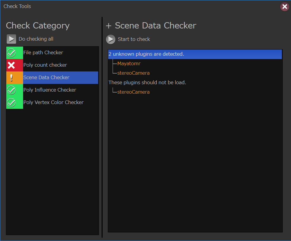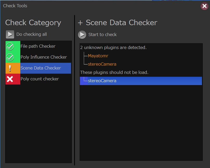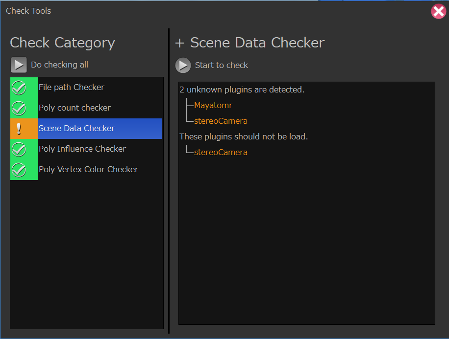 # sceneDataCheckerには不要と判断するプラグイン名のリストをオプションで指定する必要がある。